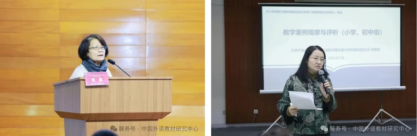 1月21日的培训聚焦教学转化与实践应用。上午,高中组与小学、初中组同步开展教学案例观摩与评析活动。参训学员以小组为单位观看教学案例,在研讨基础上形成共识并进行汇报展示。北京外国语大学国家教材建设重点研究基地副主任张莲教授、杨鲁新教授对教学案例进行详细点评,引导学员在具体教学情境中将课程标准理念与教学实践融会贯通。