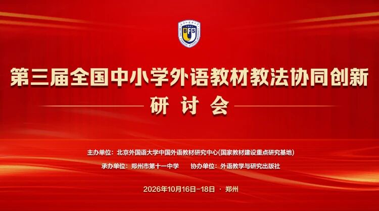 为深入贯彻落实教育部关于新时代基础教育扩优提质,夯实全面提升国民素质战略基点的决策部署,全面落实立德树人根本任务,深化大中小学协同育人机制,共同探讨外语教育教学改革新路径,北京外国语大学中国外语教材研究中心(国家教材建设重点研究基地)定于2026年10月16日至18日在郑州举办“第三届全国中小学外语教材教法协同创新研讨会”。